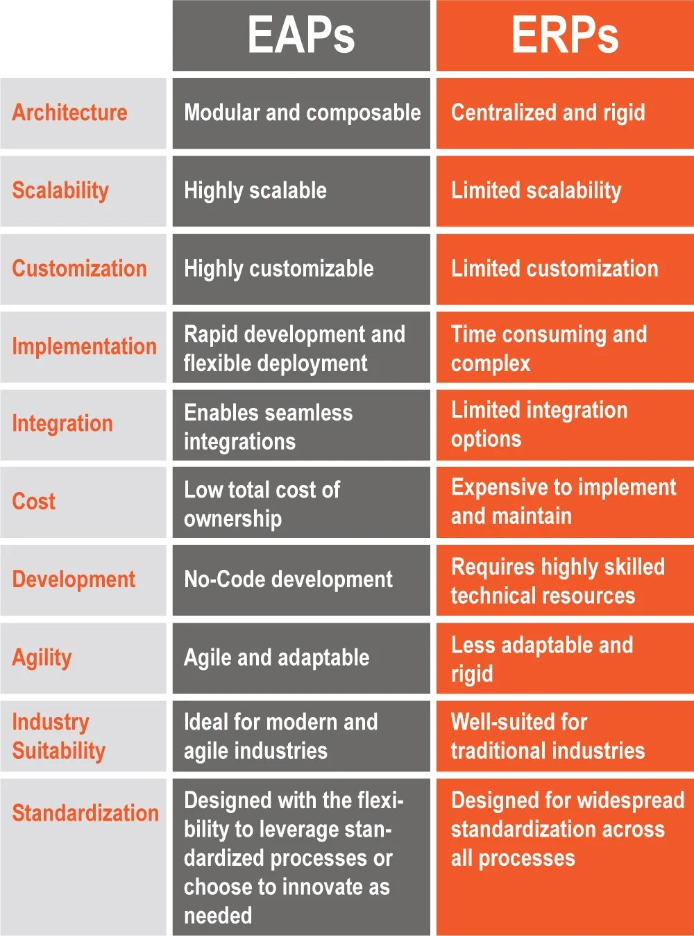 EAPs are popular for businesses who find themselves slowed by aging architectures, but don't want to undergo a major rip-and-replace project. Unlike ERPs, EAPs can solve business problems with a modular approach, offering a variety of packaged capabilities that can be singularly used, or used to compose larger business processes and workflows.